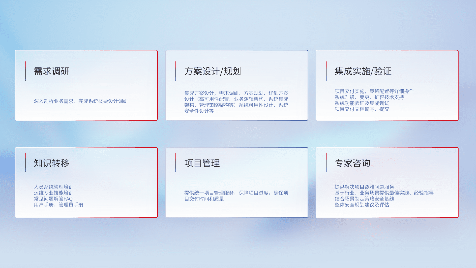 针对客户行业特性,,,将宏观的安全战略和需求,,,,通过专业的交付服务,,,,实现项目落地,,,,为客户提供标准规范的集成交付服务。。